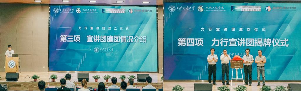 王朝晖、薛周利、苏翔、陈晨共同为力行宣讲团揭牌。陈晨、王朝晖向力行宣讲团负责人杨江坤、威尼斯9499登录入口团工委书记苏宇授旗。