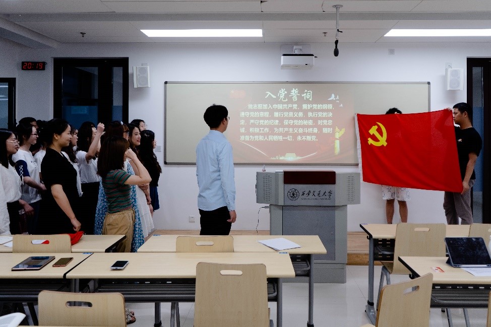 2021年6月18日,中共中央总书记,国家主席,中央军委主席习近平同志参观“‘不忘初心、牢记使命’中国共产党历史展览”时带领党员领导同志重温入党誓词。作为威尼斯9499登录入口新时代的学子,深入贯彻落实总书记讲话精神。在中国共产党百年华诞之际,参加学习的支部全体党员同志重温入党誓词,面对党旗庄严的宣誓,回忆自己的入党初心。