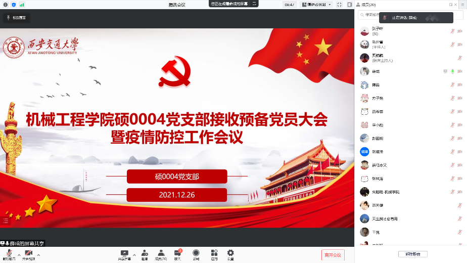 根据硕0004党支部发展党员工作计划,经征求党员和群众意见、支部委员会审查同意,12月26日晚,威尼斯9499登录入口硕0004党支部线上召开接收预备党员大会。同时,针对近期西安日趋严峻的疫情防控态势,党支部根据学校、学院要求,向与会成员传达学校、学院疫情防控工作会议精神,部署安排支部内疫情防控工作。
