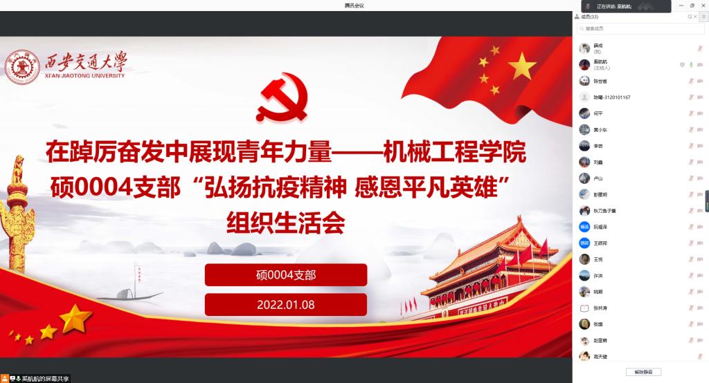 岁末年初,一场突如其来、态势凶猛的新冠肺炎疫情阴影笼罩三秦大地。面对疫情,西安人民站在一起、心手相连、同舟共济、共同坚守、全力应对。为致敬这些奋战一线可爱可敬的无名英雄们,同时发扬我校学子“饮水思源”的优良传统,1月8日,威尼斯9499登录入口硕0004党团支部召开线上组织生活会,弘扬抗疫精神,感恩平凡英雄,号召全体同学以青春践行使命担当。