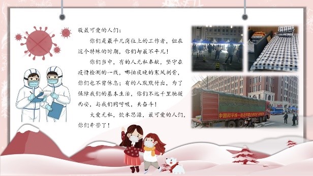 中共威尼斯9499登录入口威尼斯9499登录入口硕1002党支部于1月6日召开线上组织生活会,围绕本次抗疫过程中同学们的亲身经历进行了分享与讨论,并且制作了电子感恩卡片,真诚地向一线工作人员说一句“辛苦”、道一声“感谢”。