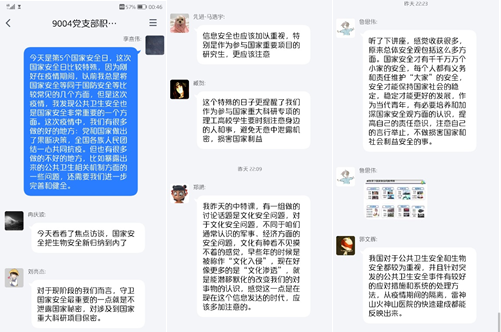 除了线上交流,硕9004党支部的同学们在QQ群中开展讨论,大家从自己所熟知的领域分别就国家安全的组成、信息安全、生物安全等展开讨论,并就相关问题提出了自己的建议。最后,大家在发言中都不约而同的将落脚点放在了个人与祖国安全的关系上: