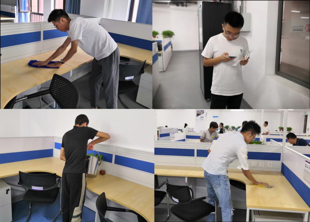 会后,为响应“科创月”建设新港平台、构筑高地号召,两支部联合组织开展了志愿服务活动,在4-2区开展张贴新生工牌,卫生扫除,浇灌绿植等活动,迎接即将到来的20级新同学,为新港建设贡献支部力量。大家分工明确,有序进行各项工作,经过大家的携手努力,新生的工牌全部粘贴完毕,落满尘土的工位也焕然一新,与得到滋润的绿植一起,共待新同学的来临。