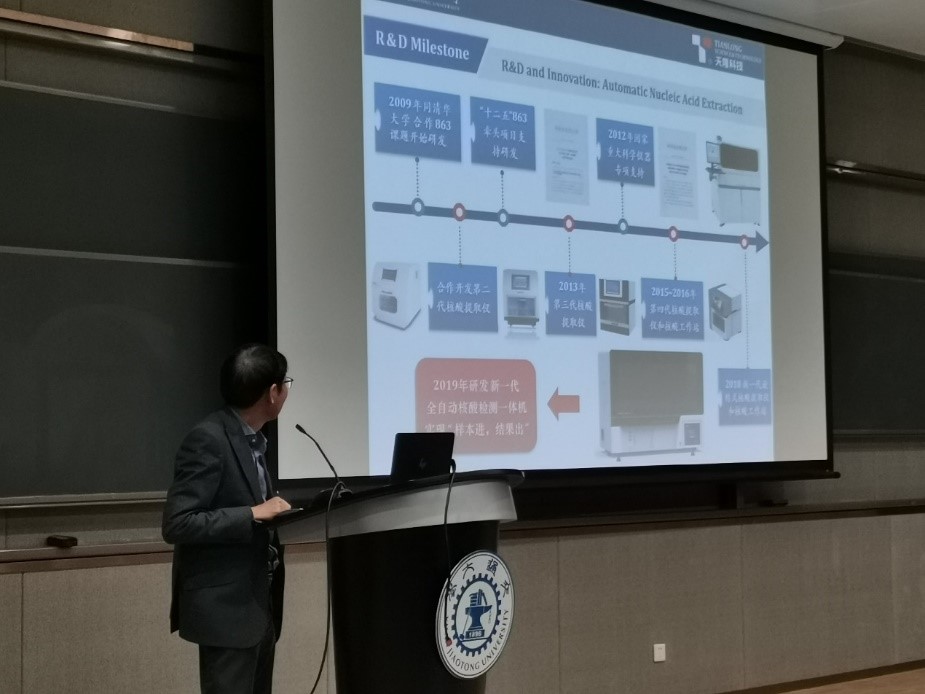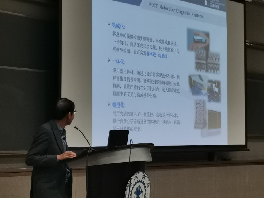 第二部分中,彭教授为大家介绍了他带领团队研发的全自动核酸检测一体机,该设备具有集成化、一体化和微型化的特点,另外教授还介绍了成果研发的一步步历程,让同学们深刻感受到了科学研究的重要意义。