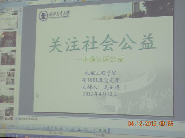 上午10时,组织生活会准时开始。首先由组织委员龙彬同学清点人数,通报党员积极分子出席情况。硕1001党支部书记李志林简单总结了支部在前一阶段的工作,并谈到了现在社会公益活动的现状:大学中各种志愿者活动层出不穷,社会上打着公益旗号的活动形形色色,究竟什么是公益,怎样做公益?由此引到本次生活会的主题“关注社会公益”。