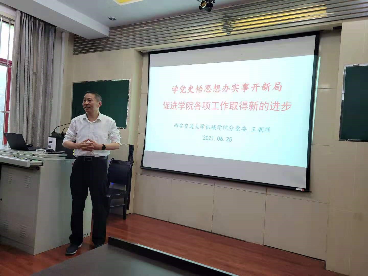 王朝晖书记在讲授专题党课时谈到,习近平总书记在党史学习教育动员大会上的讲话,为我们学习党史指明了方向。我们学习党史应该深刻理解党史学习的重大意义,明白“为什么学”,“怎么学”和“学习什么”。作为教育工作者,不仅要学校党史了解党的政策与战略发展方向,还需要深入了解中国共产党领导下的新中国高等教育史、科技创新史等相关历史。学习党史要结合学校与学院的实际情况,深入学习和理解习近平总书记在中国科学院第二十次院士大会、中国工程院第十五次院士大会、中国科协第十次全国代表大会上的重要讲话精神。建设一流大学要不断提高人才培养质量,想国家之所想、急国家之所急、应国家之所需,坚持把立德树人作为根本态度,以勇于担当的责任感积极推进学院创新港建设、“6352”工程等各项工作。随后,王朝晖以学校、学院发展中与每位师生密切相关的事项为切入点,讲述了实际工作中如何践行党史学习和总书记讲话精神,勉励青年师生党员主动将个人未来发展融入到学校和学院发展大局中,努力做好立德树人的本职工作。