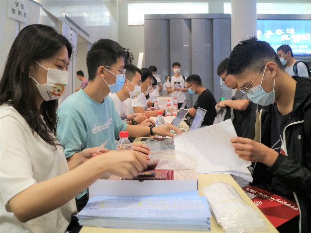 早上八点,迎新人员与物资全部准备就绪,学院领导老师和迎新志愿者们都在期待新生的到来。按照疫情防控要求,在二号巨构大厅内设立报到注册点,通过博士、学术硕士和专业硕士三路办理报到手续,现场分工明确、配合默契,迎新工作井然有序。