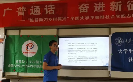 为响应党的二十大报告中强调的“加大国家通用语言文字推广力度”,团队积极参与推广和全面普及国家通用语言文字,先后在广西壮族自治区河池市宜州区刘三姐镇和怀远镇、环江毛南族自治县以及河池市对当地民众进行采访,邀请其通过填写调查问卷等方式,了解当地国家通用语言文字普及情况和质量情况。了解到调研地主要以少数民族语言为主,日常讲普通话意识较弱,但民众普遍认可普通话对于乡村产业的发展的推动作用,高度认同普通话的重要性,有强烈意愿学习普通话,为此团队成员分别在河池市宜州区刘三姐镇、贺州市平桂区为当地儿童开展普通课堂,讲授孩子们正确的普通话发音,并针对一些易写错读错的字进行正形纠音,同时绘画推普墙绘,以此扩大推普影响力。