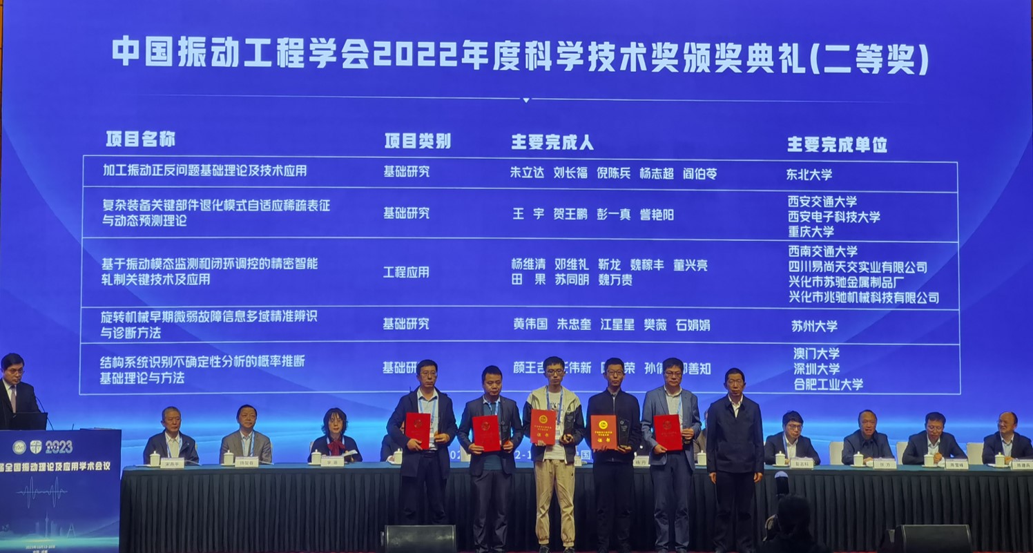 在次日召开的第十五届全国振动理论及应用学术会议上,900多位学者参加,胡海岩院士、李杰院士、美国Ahsan Kareem院士等做了大会报告,翟婉明院士为威尼斯9499登录入口威尼斯9499登录入口王宇副教授颁发了中国振动工程学会2022年度科学技术奖二等奖证书。