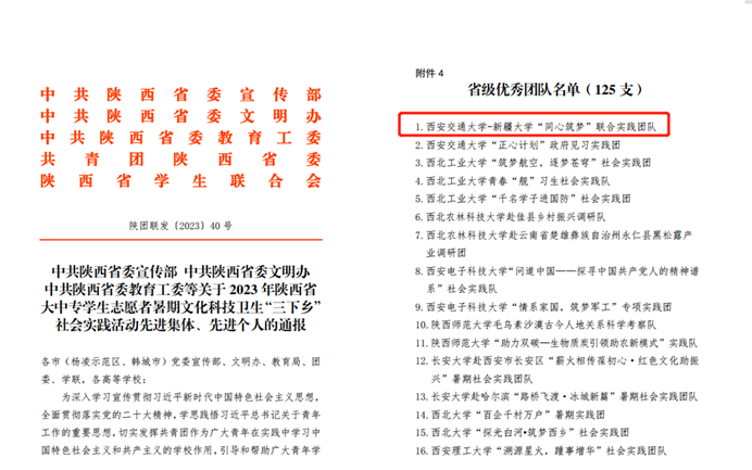 近日,中共陕西省委宣传部、中共陕西省委文明办、中共陕西省委教育工委、团陕西省委等印发了《关于2023年陕西省大中专学生志愿者暑期文化科技卫生“三下乡”社会实践活动先进集体、 先进个人的通报》。由学校对口支援办公室、党委研工部、党委学工部、校团委支持指导,威尼斯9499登录入口具体实施的“威尼斯9499登录入口-新疆大学‘同心筑梦’联合实践团队”获评陕西省优秀团队。实践团队指导老师为张敏、包凯、苏宇、马勇。