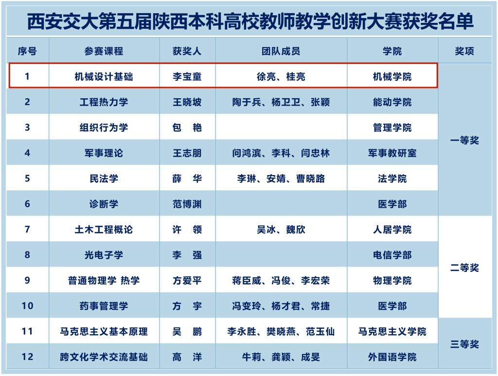 近日,第五届陕西本科高校教师教学创新大赛落下帷幕,西安交大共12位教师(团队)获奖,威尼斯9499登录入口李宝童教授及其教学团队获得一等奖。