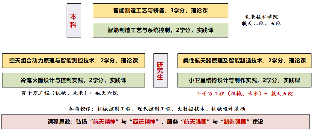 该系列课程前期邀请了王春民、陈晖、刘乃金、李光熙、王鹏飞、赵少凡等航天企业的专家总师进课堂,数千人次听课学习,反响热烈、效果显著。课程以校企需求导向,真正将企业需求转化为具体教学内容,打通产教融合的“最后一公里”。该系列课程按照企业工程需求定制化学生知识图谱,以工程项目为抓手落实采集式学习,在全校选修课、优质网络课中给出采集学习方案。主动对标企业需求,提升人才自主学习能力,加快培养航天制造领域拔尖创新人才,形成了特色培养理念。具体为:(1)明确企业任务主导,引企入校建立产学研深融联合体,在校企协同攻坚的过程中协同育人;(2)强化组织和管理,贯彻实战育人,面向国家重大任务选题,以企业模式落实培养过程管理;(3)改革教学模式,以企业工程需求制定学生知识图谱,以实际项目驱动进行采集式学习。