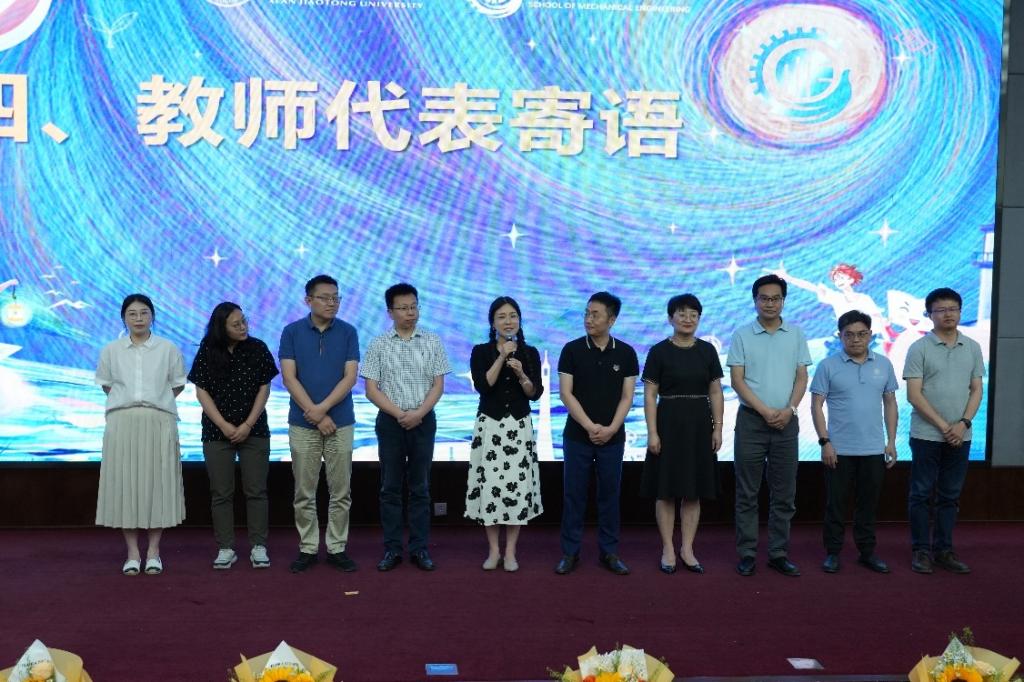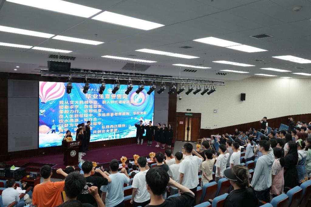 “我从交大机械毕业,融入时代建设洪流。精勤求学、敦笃励志;果毅力行、忠恕任事。在人生新征程中,永远感恩老师教诲、学院培养,饮水思源、知行合一,以梦为马、不负韶华。胸怀‘国之大者’,弘扬西迁精神;勇担国家使命,共创交大荣誉。”全体毕业生以庄重的语言表达对学校和学院的感激与不舍,以昂扬的奋斗姿态迎接人生新篇章、书写新辉煌。欢送会在“交大我爱你”的歌声中圆满结束。