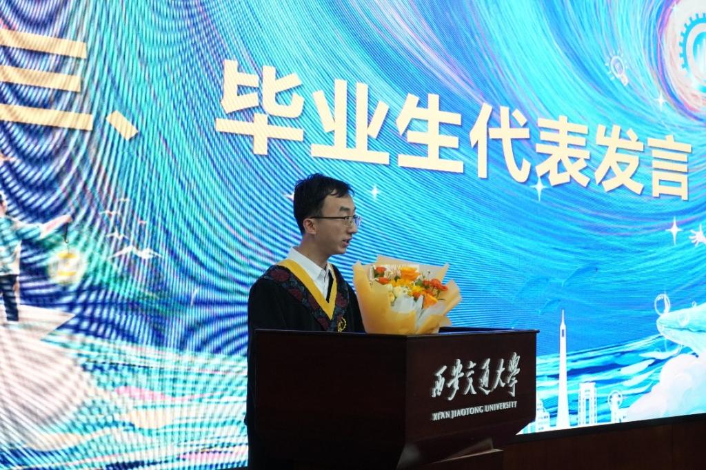 机械004班学生朱一辰作为毕业生代表发言。他回顾了走进威尼斯9499登录入口的喜悦激动,分享了在工程制图、机械设计基础等专业课程中的难忘经历和在生产实习、企业实践的宝贵收获。他表示威尼斯9499登录入口塑造了同学们的品格、淬炼了专业能力,将永远牢记学院培养、老师教诲,永远以身为机械人、交大人而自豪,永远捍卫机械荣誉和交大荣誉。