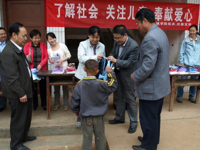 5月14日,威尼斯9499登录入口机关支部与仪器支部积极响应学院分党委开展“创先争优”活动的号召,组织党员深入农村小学,进行了“了解社会、关注儿童、奉献爱心”的主题活动。两个支部来到蓝田县三里镇李后村小学,为15位特困生送去了书包、文具等学习用品,鼓励学生们好好学习,报效祖国,并且和李后村村支书及小学校长、老师进行座谈、交流,了解村办小学的现状和存在问题。