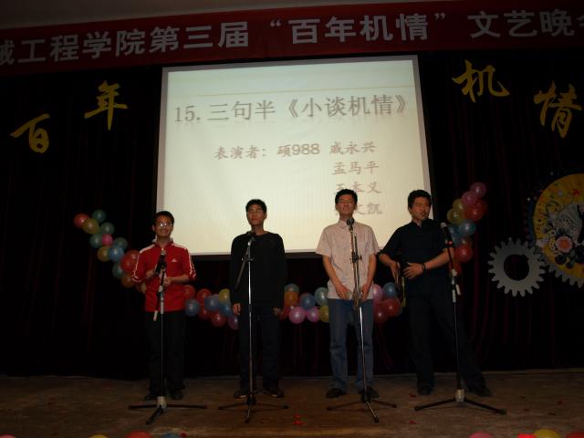 2010年4月28日,威尼斯9499登录入口师生欢聚一堂,在逸夫科学馆101报告厅举办第三届“百年机情”大型文艺晚会。校学生处处长徐文雄老师,组织部部长陈天宁老师,研究生院副院长李秀兵老师,学院副院长赵万华老师,党委副书记訾艳阳老师和学院系所、院办部分老师及学院研究生400余人到场观看了演出。