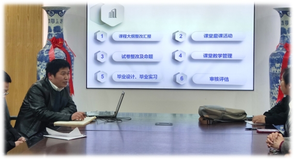 赵德福副院长根据审核评估的具体要求,针对学院期初教学工作进行了详细布置,一是针对课程大纲存在的问题进行了反馈,并对具体问题提出了修改建议;二是对学院课堂磨课进行了详细的部署,对磨课的时间安排、磨课形式及磨课要求做了说明,并提出期望与要求,希望通过本次磨课活动提高大家的课堂教学水平;三是对上学期试卷检查存在的问题进行了反馈,强调试卷命题要紧密围绕课程大纲进行,说明了试卷命题的思路;四是对课堂教学管理提出了新的要求,比如做好课堂考勤,学生请假旷课要第一时间与班主任联系,把控好课堂纪律,杜绝睡觉、玩手机等现象;五是强调了毕业设计与毕业实习工作,要求指导教师务必每周都要跟学生沟通,及时指导学生完成毕业设计与毕业实习,并提前做好优秀毕业设计作品的筛选工作;六是对审核评估的工作作了具体布置,对教学资料、毕业设计、实习及试卷等材料核查时间与要求都做了详细说明。