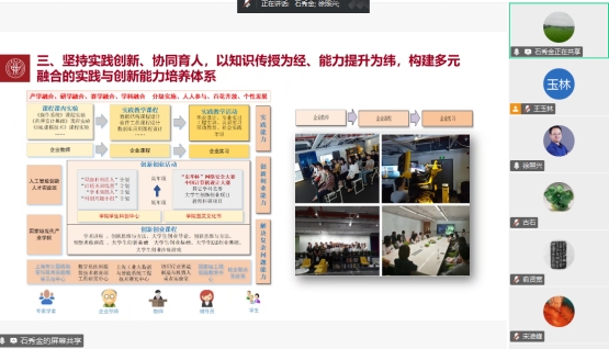 石秀金博士从思政引领,实践创新;产学融合,协同育人;学科交叉,双向赋能;院校联盟,携手并进等方面分享了在拔尖创新人才培养方面所在工作和取得的成绩。具体来说实施了“四四四”人才培养模式;以三级产教平台为抓手,构建协同育人共同体;以“计算机+”为其他学科赋能,科教融合;以纺织服装特色院校计算机学科联盟为平台,共享、共建、共赢等。