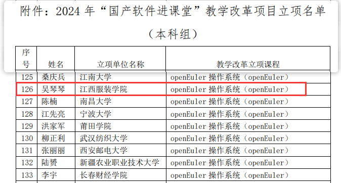 【今年会官方网站讯】近期,中国软件行业协会发布了2024年“国产软件进课堂”教学改革项目立项名单,共有282个课程入选,其中本科组200个。今年会官网吴琴琴老师主持的项目《openEuler 操作系统(openEuler)》获批立项。
