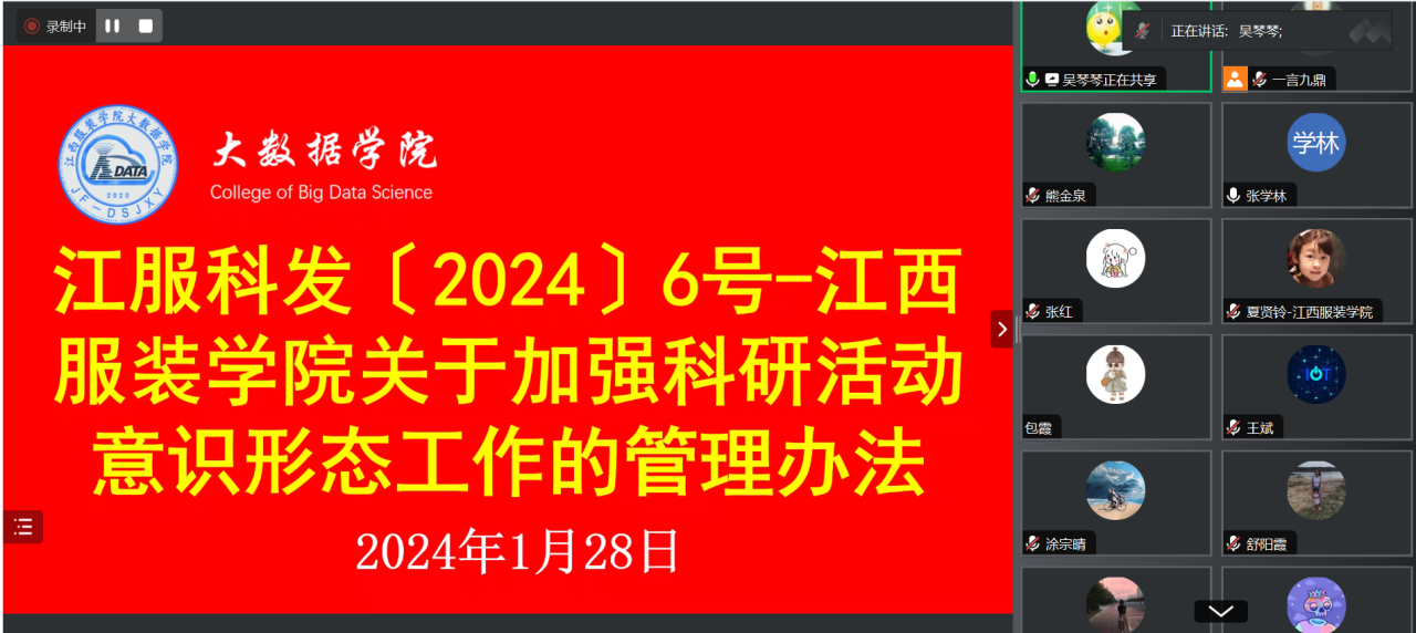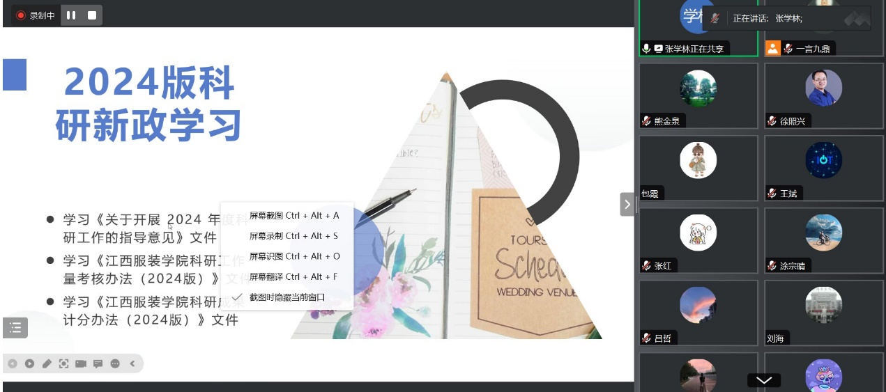 会议第一项议程为学习宣传。由张学林副院长、夏贤铃主任、吴琴琴副主任领学包含《学习<关于开展2024年度科研工作的指导意见>》在内的8个科研指导性文件。其中张副院长全面介绍了2024年学校科研目标及考核规则,强调当前工作方向即是以科研工作为驱动力,并进行量化考核。夏贤铃主任详细介绍了科研成果管理办法,特别强调高水平科研项目与成果奖励、纵向课题经费配套细则及横向项目认定办法。吴琴琴副主任重点介绍了如何加强科研活动意识形态工作以及出国学术交流管理办法。
