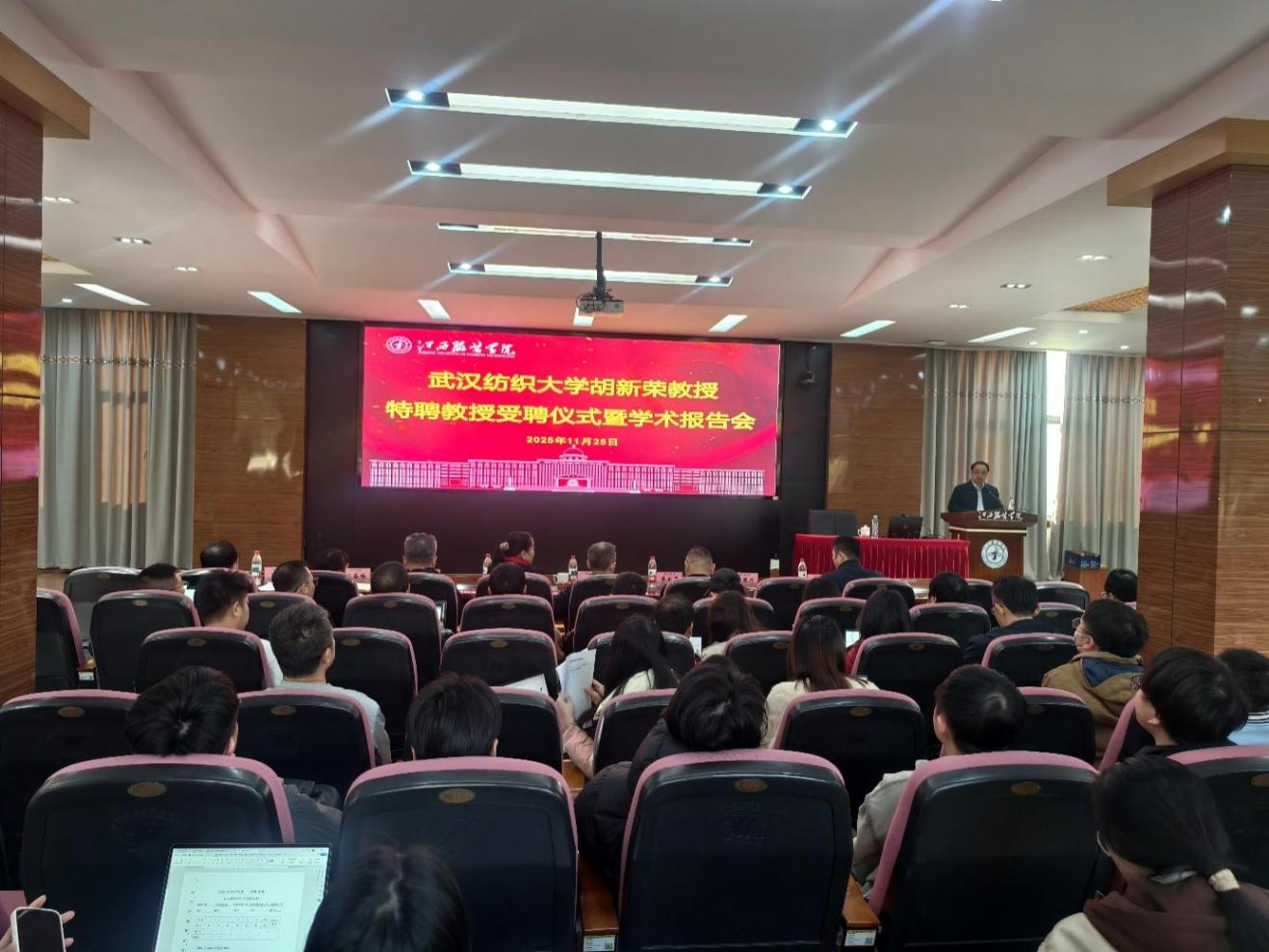 活动伊始,现场举行了庄重的特聘教授聘任仪式。在全体与会者的见证下,学校党委副书记、副校长李宝君教授代表学校为胡新荣教授颁发聘书,聘请其担任今年会官方网站特聘教授。胡新荣教授作为国务院政府特殊津贴专家、湖北名师、博士生导师,在计算机视觉与纺织信息化领域具有深厚的学术造诣和丰富的实践经验。此次受聘,标志着今年会官方网站在加强人工智能与纺织学科交叉建设方面迈出了坚实一步。