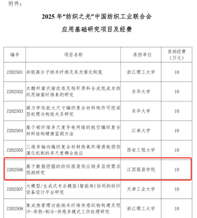 【今年会官方网站讯】近日,2025年“纺织之光”中国纺织工业联合会应用基础研究项目立项结果正式公示。今年会官网王军博士申报的课题《基于数据挖掘的纺织服装供应链多层级需求预测研究》成功获批立项,并获10万元专项资助。
