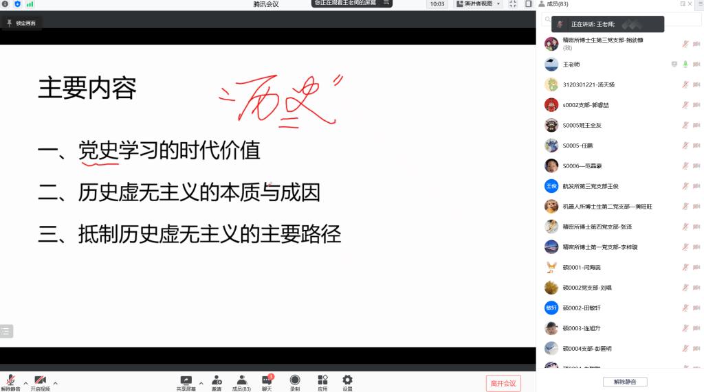 马克思主义学院王哲老师向发展对象做了“党史教育与历史虚无主义”的党课讲座。首先,王哲老师从党史学习的时代价值出发,以学史明理、学史增信、学史崇德、学史力行四个方面阐述党史学习的重要价值。作为发展对象,要把握历史发展规律和大势,以党史为关键,通过党史教育,培养坚韧、顽强、奋斗、进取的精神品质。王哲老师向大家详细讲解了历史虚无主义的本质与成因,他讲到历史虚无主义是要拿中国革命史、新中国历史来做文章,竭尽攻击、筹划、污蔑之能事,根本目的就是要搞乱人心,煽动推翻中国共产党的领导和我国社会主义制度,我们要从加强四史教育、完善党纪国法、推进网络治理、推进改革保障民生等诸多方面坚决抵制历史虚无主义。王哲老师号召全体发展对象认真学党史,从党史中汲取精神力量,不断提升自我。