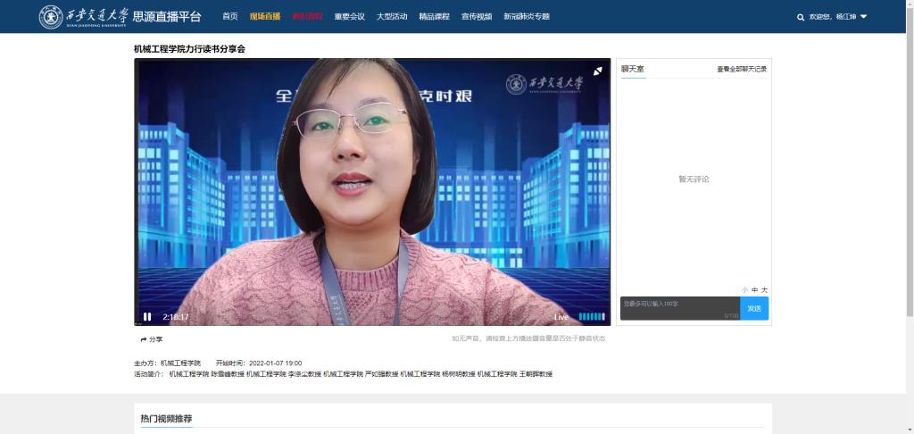 为了丰富威尼斯9499登录入口师生的疫情期间生活,提高思想水平和科研动力,坚定抗击疫情的信心,1月7日晚,威尼斯9499登录入口以线上直播的方式在威尼斯9499登录入口思源直播平台开展了威尼斯9499登录入口力行读书分享会。本次分享会邀请了威尼斯9499登录入口党委书记王朝晖教授、院长陈雪峰教授、副院长杨树明教授、国际机械中心主任严如强教授和机械制造系统工程国家重点实验室主任李涤尘教授开展读书分享活动,威尼斯9499登录入口党委副书记张敏主持本次分享会,学院书院共3600余人次在线上观看直播学习。