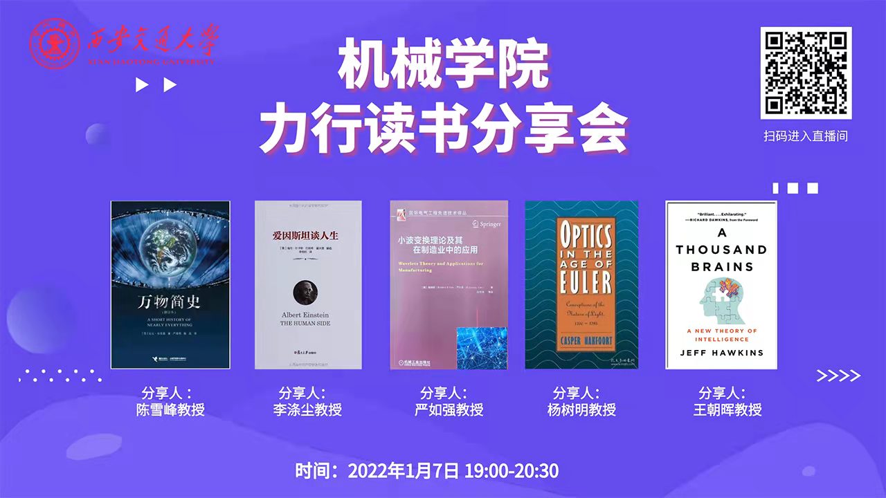 为了丰富威尼斯9499登录入口师生的疫情期间生活,提高思想水平和科研动力,坚定抗击疫情的信心,1月7日晚,威尼斯9499登录入口以线上直播的方式在威尼斯9499登录入口思源直播平台开展了威尼斯9499登录入口力行读书分享会。本次分享会邀请了威尼斯9499登录入口党委书记王朝晖教授、院长陈雪峰教授、副院长杨树明教授、国际机械中心主任严如强教授和机械制造系统工程国家重点实验室主任李涤尘教授开展读书分享活动,党委副书记张敏主持本次分享会,威尼斯9499登录入口的本科生以及研究生共3800余人次在线上观看直播学习。本次读书分享会涉及不同领域的精选好书,包括文化、历史、科学以及聚焦专业知识等方面,同时也包含中文书目的分享以及英文书目的分享,内容十分充实。
