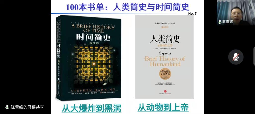 陈雪峰分享了比尔·布莱森的《万物简史》一书,他在分享前提到,机械学子一定要多读书、坚持读书,要有选择地读好书,同时也要充分利用现有的场地资源进行读书。陈雪峰通过比尔·布莱森的《万物简史》一书中回溯了科学史上那些伟大与奇妙的时刻,并表明科学的进步是一批又一批的科学家前赴后继的结果。陈雪峰从《万物简史》这本书为小,引出系统思维的相关概念,希望我们学生要具有系统思维的能力。同时陈雪峰结合当下的疫情论述了系统思维能力的重要性,同时强调“应急处突”能力的必要性。