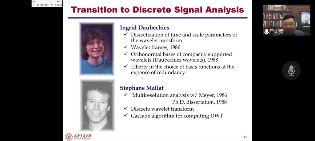 严如强分享了《小波变换理论及其在制造业中的应用》一书,他从心电图信号、鸟儿歌声的信号和机械振动的信号来引出信号的定义,即承载某种信息并作为通信手段的物理量,而信息是物理系统的状态或特征信息。系统阐述了关于信号以及信号处理的目标问题。严如强强调,本书的借鉴意义很强,要学习工程领域信号的分析、加工、识别、传输和存储等问题的处理方法,来探索小波分析在信号处理中的重要应用。