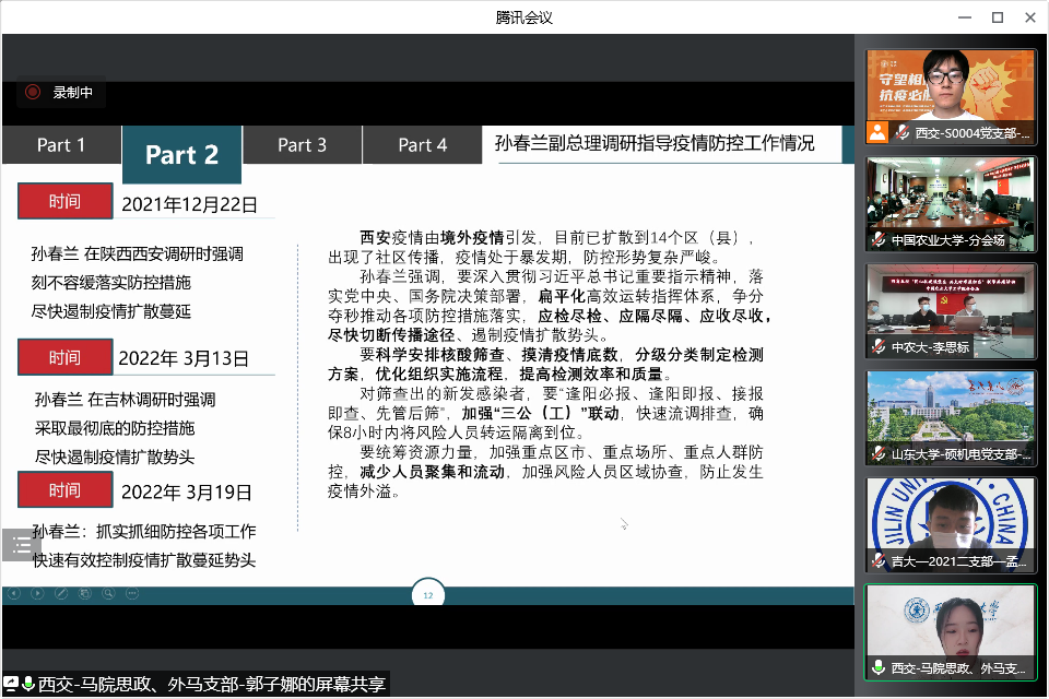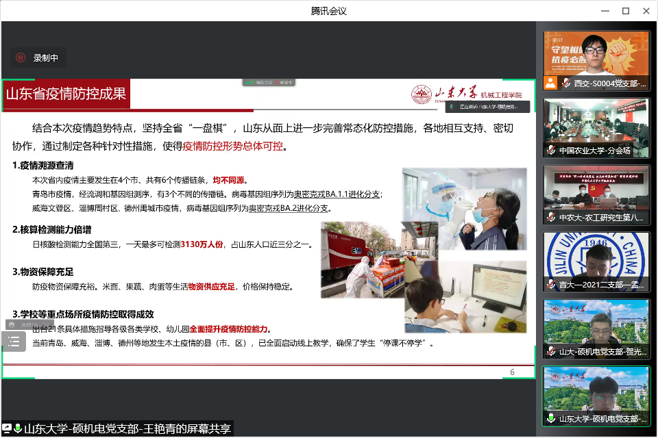 吉林大学机械与航空航天工程学院2021级研究生学生二支部书记孟昊楠介绍当前吉林疫情形势,分享了吉大人上下同心,师生携手共克时艰的暖心举措,传递着坚强又感人的战“疫”力量,表达了吉林自有吉临时,长春定复往常春的坚定信念。山东大学硕机电党支部书记王艳青从加强化风险管控、严格化进出管理、常态化核酸检测和日常化防护四个方面介绍了山大的战“疫”措施,并寄语广大党员众志成城打赢疫情防控阻击战。中国农业大学工学院农工研究生第八党支部书记李思标围绕支部概况、疫情防控进行介绍,并分享了北京冬奥会在疫情防控中采取闭环管理的防疫成效。