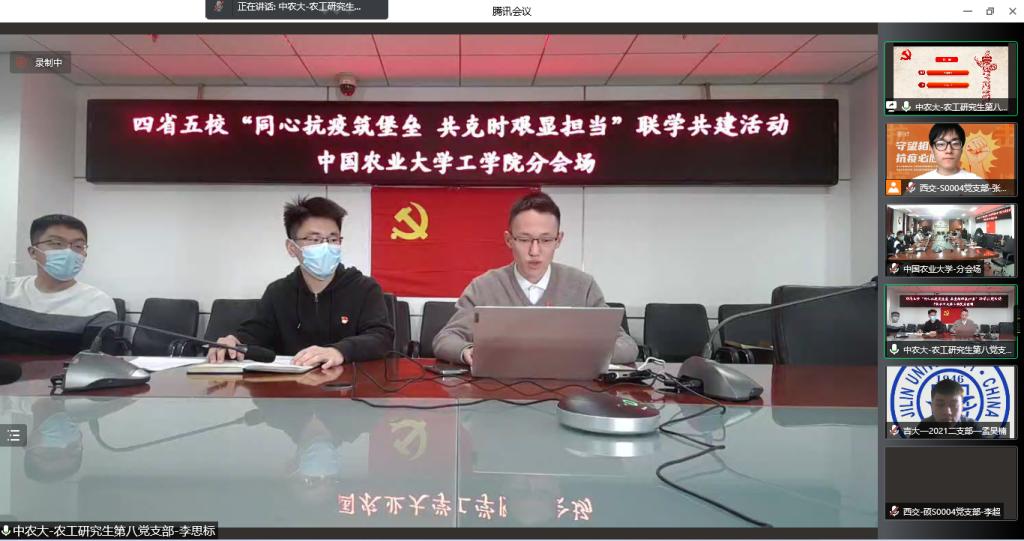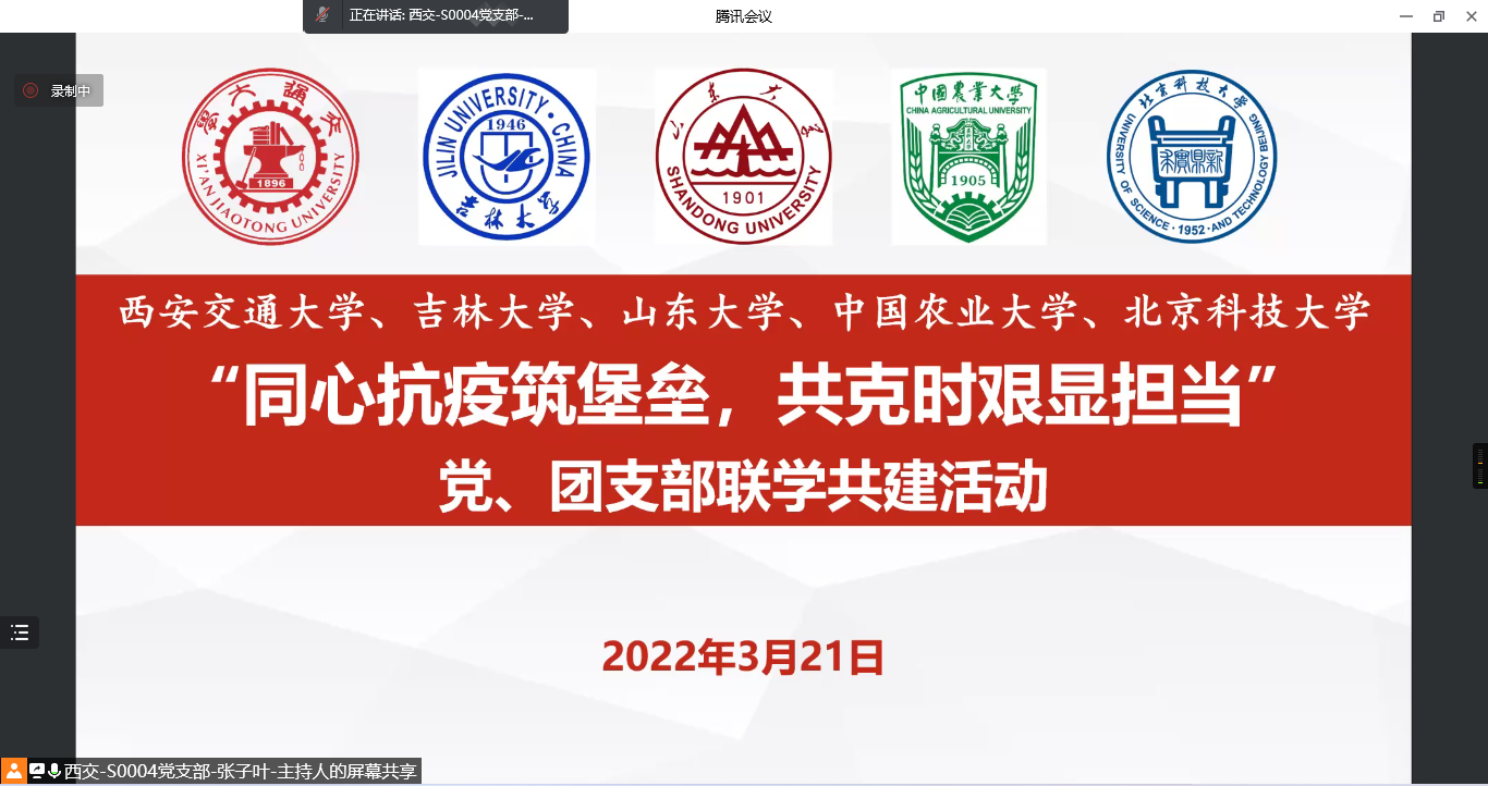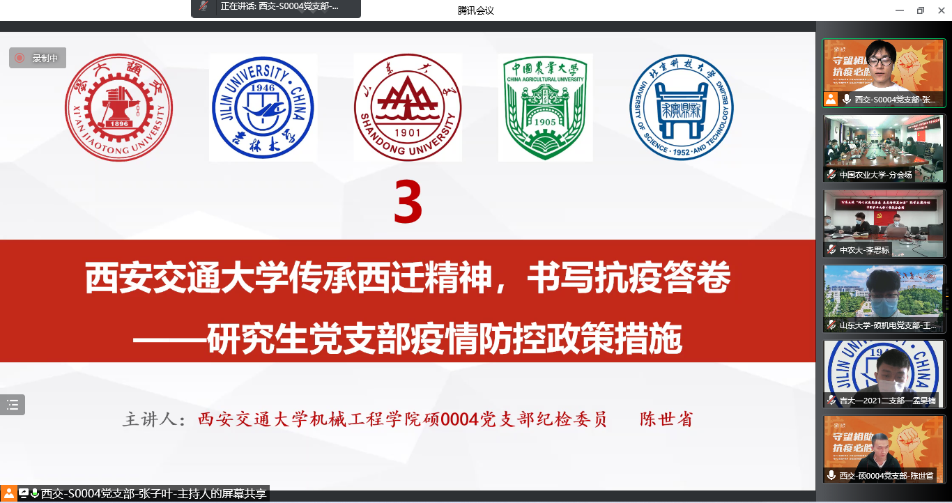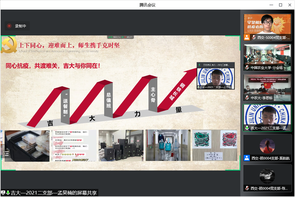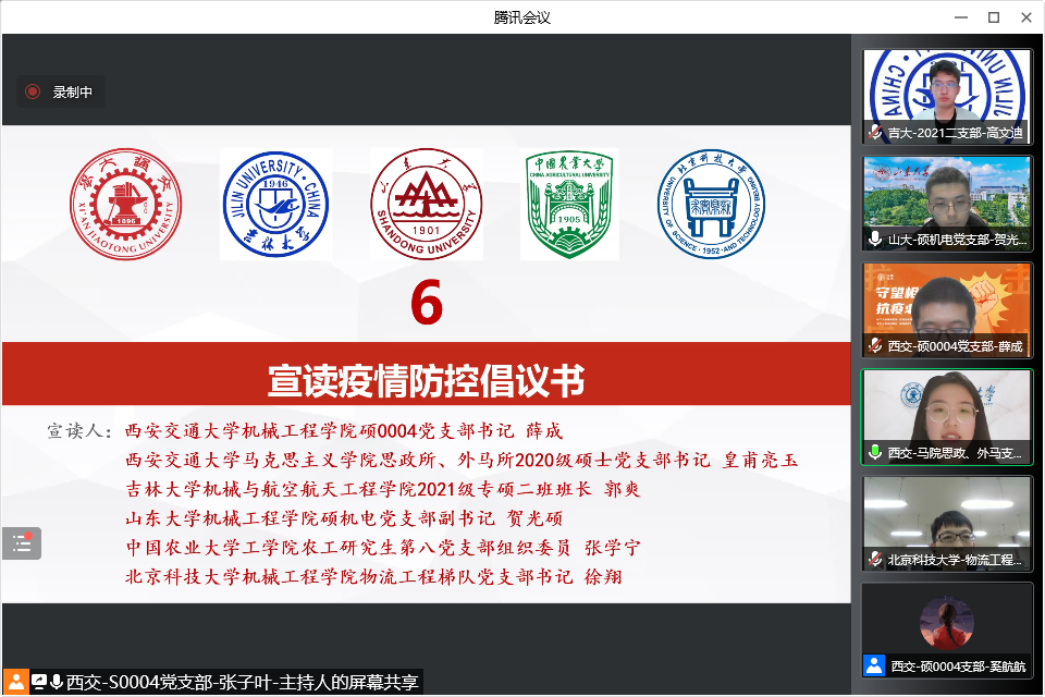 自三月份以来,全国多地发生本土聚集性疫情,尤其以吉林、山东等地的疫情防控形势较为严峻复杂。为深入学习好总书记关于疫情防控工作的重要指示精神,增强与各地高校研究生党支部之间的交流,体现研究生党支部在疫情防控中的重要作用,传递战“疫”必胜的信心,由威尼斯9499登录入口威尼斯9499登录入口党建工作办公室和硕0004党支部发起,与威尼斯9499登录入口马克思主义学院思政所、外马所2020级硕士党支部、威尼斯9499登录入口马克思主义学院硕0124团支部、吉林大学机械与航空航天工程学院2021级硕士学生第二党支部、山东大学威尼斯9499登录入口硕机电党支部、山东大学威尼斯9499登录入口2020级学硕一班团支部、中国农业大学工学院农工研究生第八党、团支部、北京科技大学威尼斯9499登录入口物流工程梯队党支部共五所高校八个党、团支部开展“同心抗疫筑堡垒,共克时艰显担当”支部联学共建活动。