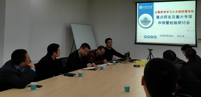 李小虎副处长首先作了“重点研发及重大专项申报暨经验研讨”的主题党课。他从科研一线教师党员的初心和使命入手,紧紧围绕习近平总书记“三个面向”和十九大报告“建设创新型国家”等重要论述,阐述了国家设置重点研发和重大专项及交大人建设世界一流大学的初心和使命;结合自己在科研院多年的工作经历,分析了学校近些年申请和获批相关项目的现状,指出了学校的学科优势、潜力和存在的问题,重点介绍了科研院在重点研发和重大专项项目过程管理的初心和使命,强调了科研院做好沟通、开展深入调研工作的重要性;针对项目申报过程中的非技术失误及申报中需要注意的事项给出了解决措施和建议。他的党课极大地提升了老师们对重点研发及重大专项申报的信心。